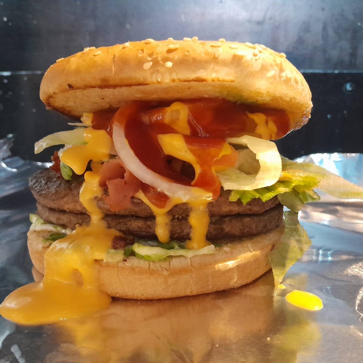 hamburguesa con doble carne,doble jamon y winnie con aderezos y verduras y aguacate