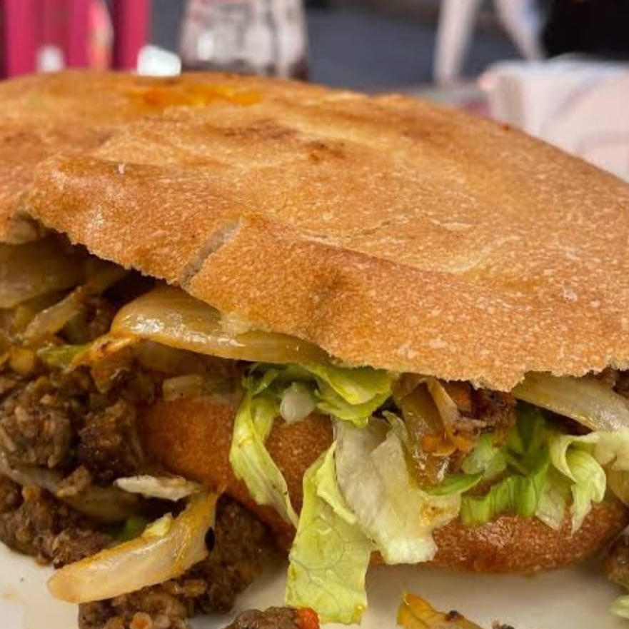 Pan de torta con mayonesa, carne de bistec, lechuga, tomate, mostaza y cebolla, aguacate