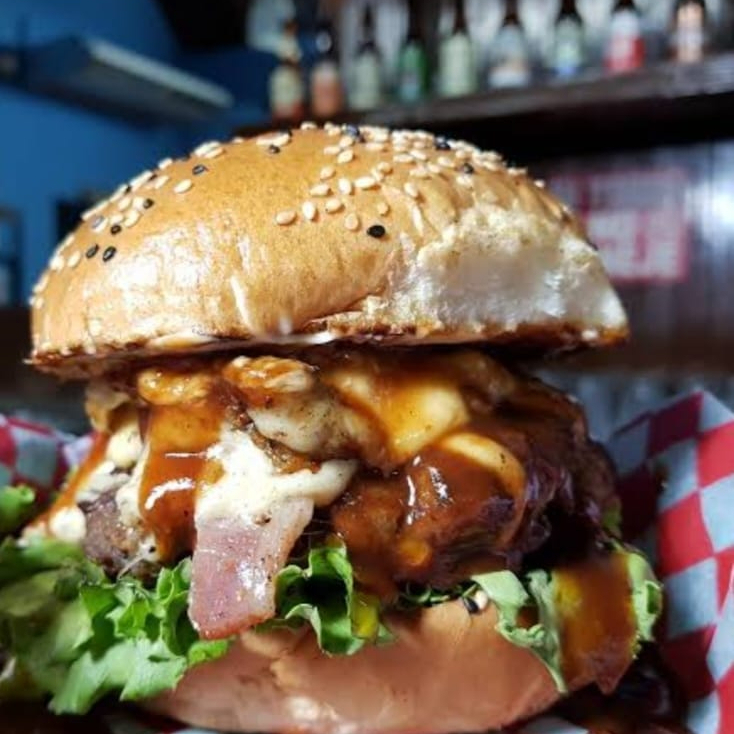 Hamburguesa de bistec,Winnie, jamón, queso, lechuga, tomate, cebolla, líquidos y aguacate
