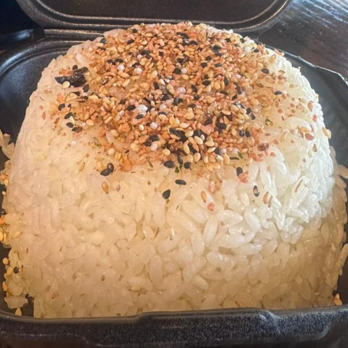 Arroz blanco, cangrejo, aguacate, furikake, katsuito y cebollín.