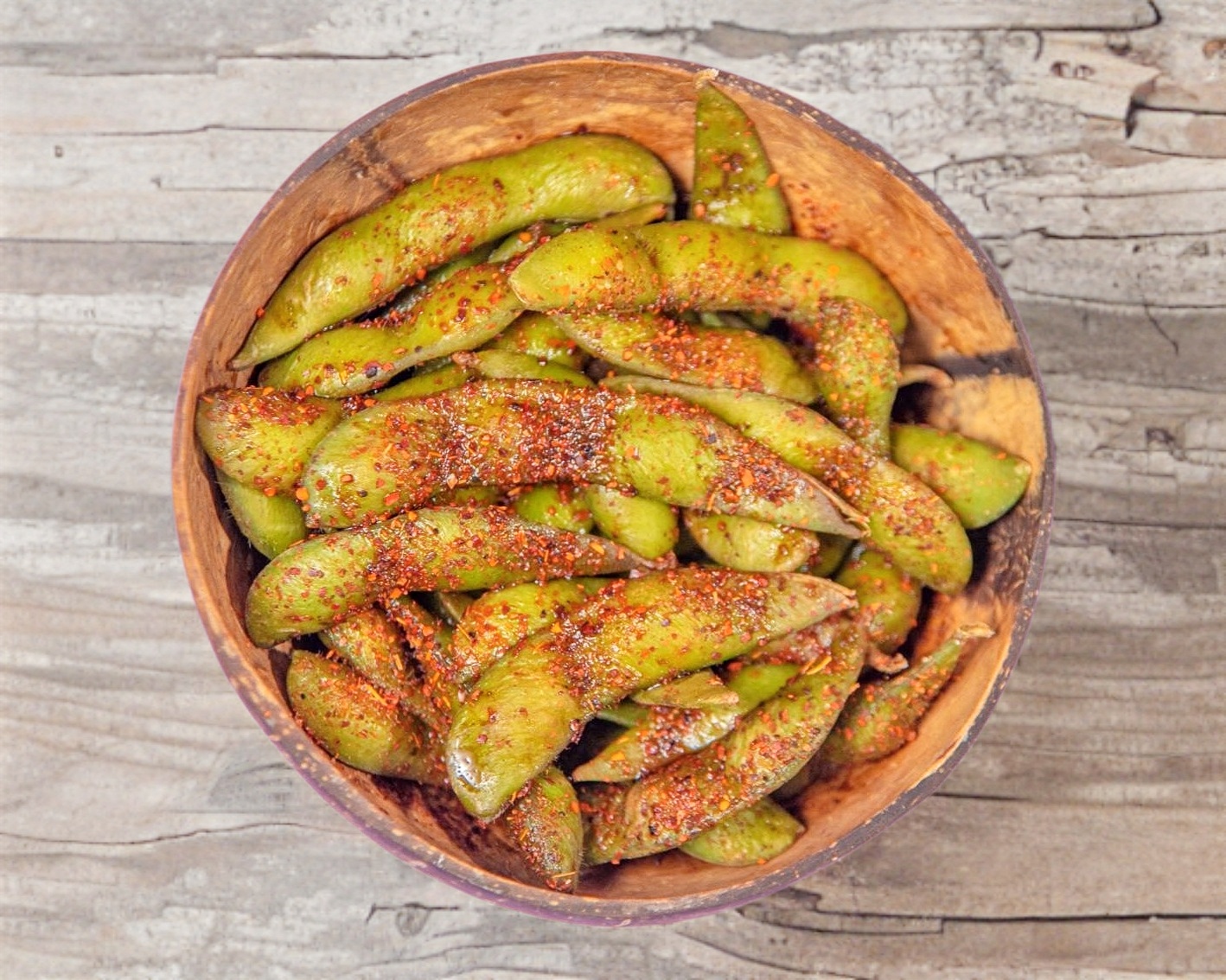 Edamames en su vaina con salsa de soya, cítricos y polvo tajín.