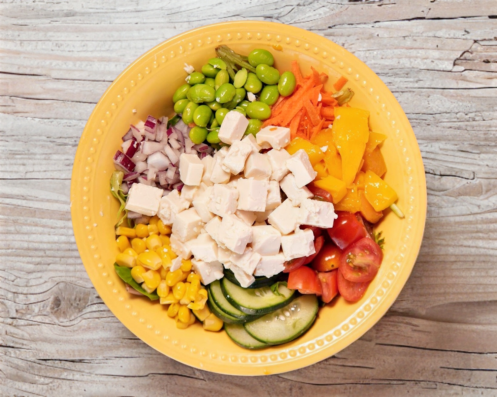 Tazón de tofu de 24 onzas con una base de arroz para sushi, arroz integral o lechugas mixtas acompañados con Cebollin, Elote, Edamames, Germinado, Cebolla Morada, Zanahoria, Flor de Jamaica, Pepino, Tomate, Cacahuate bañados en salsa Ponzu y Mango Habanero.