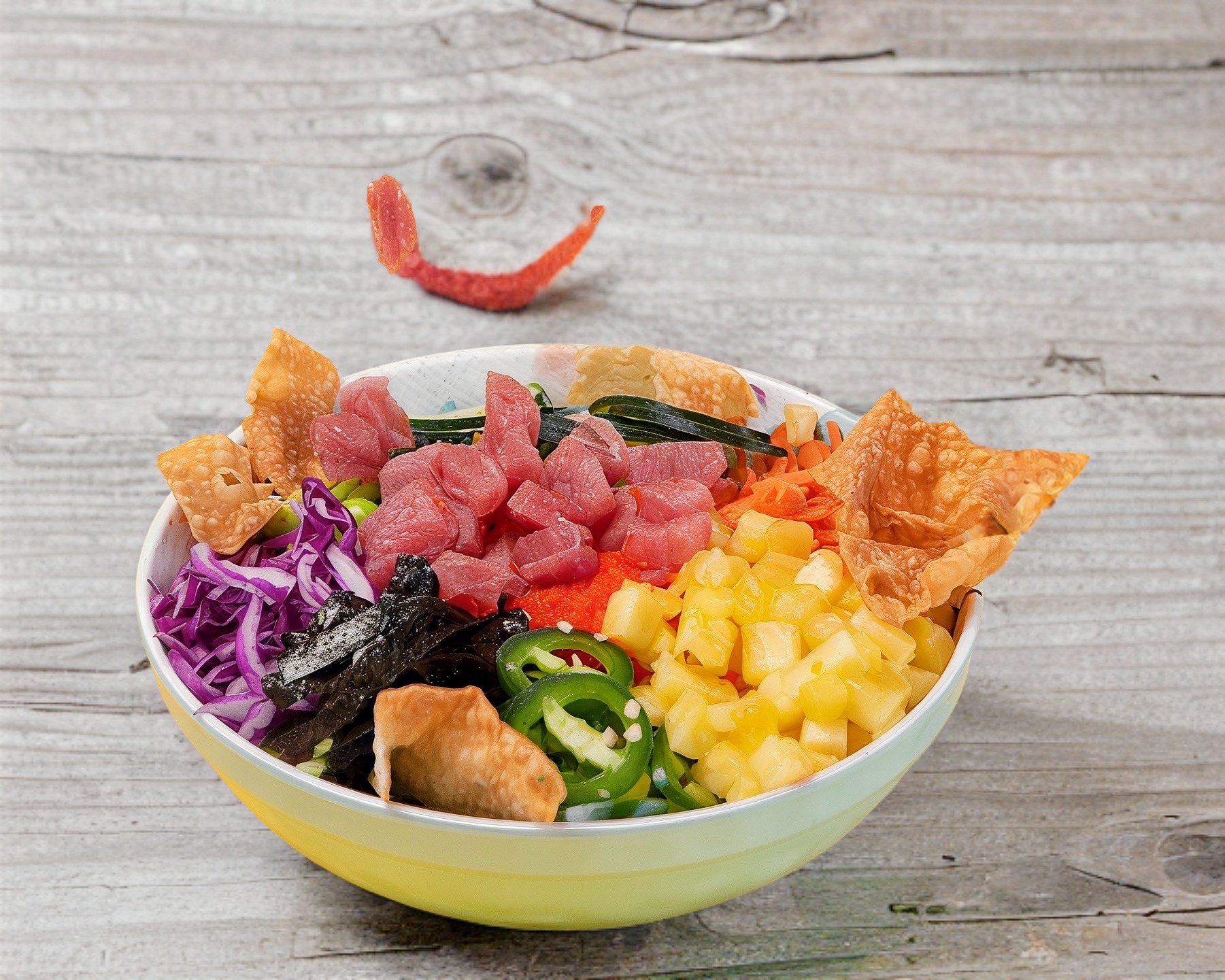 Tazón de atún con una base de arroz para sushi, arroz integral o lechugas mixtas acompañados con Cebollín, Edamames, Jalapeños, Repollo, Zanahoria, Piña, Pepino, Wonton Chips bañados en Salsa Ponzu y Hawaii Spicy.