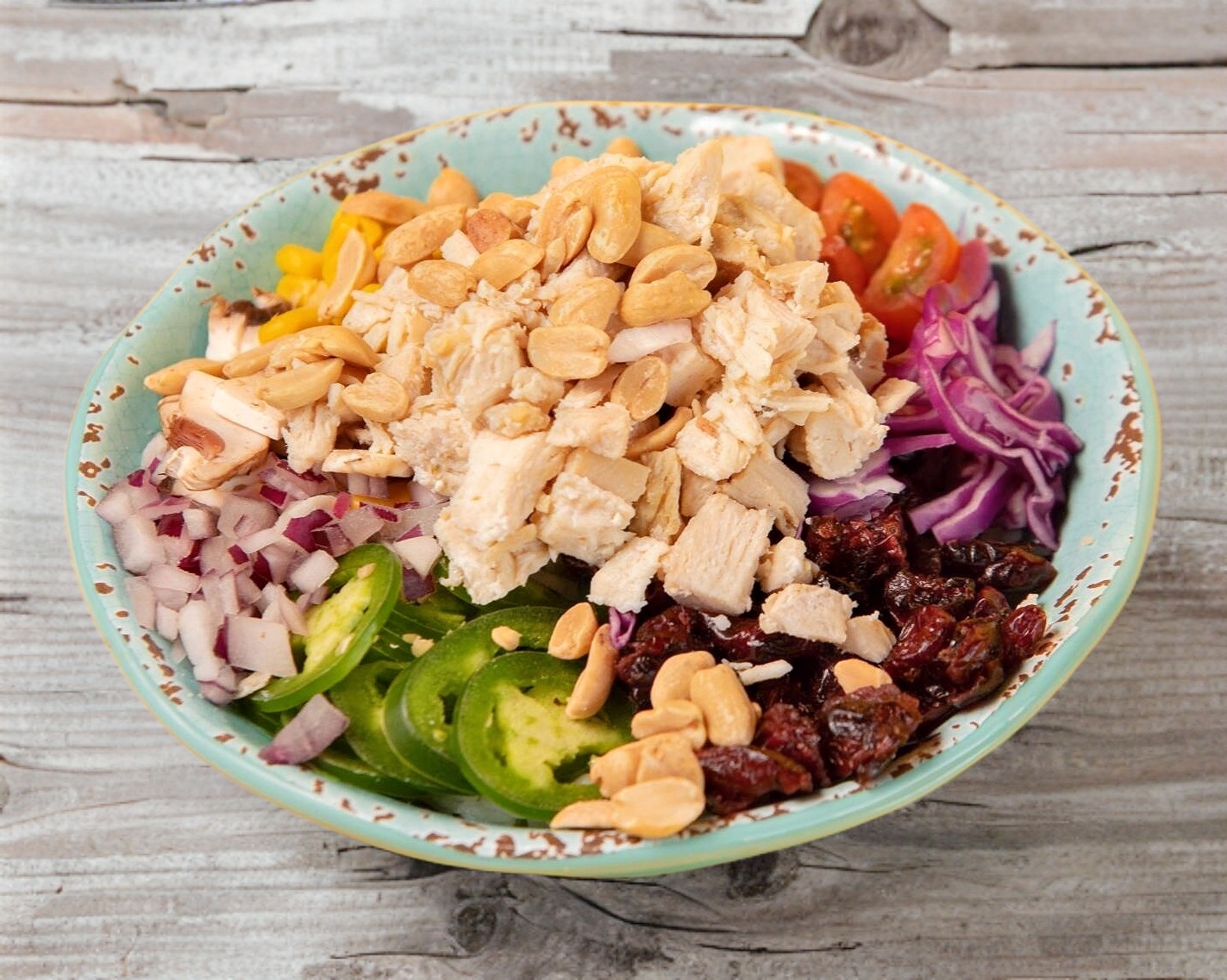 Tazón de pollo con una base de arroz para sushi, arroz integral o lechugas mixtas acompañados con elote, germinado, cebolla morada, col morada, jalapeños, champiñones, tomate cherry, arandanos, cacahuate bañados en salsa toreada y hawaii spicy.