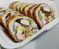 Arroz blanco al vapor cubierto de queso crema, aguacate, cangrejo y pasta tampico.