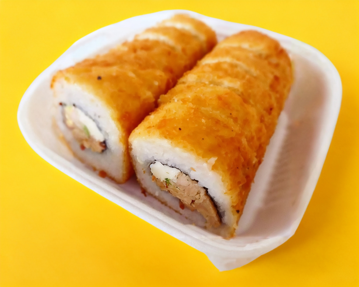 Camarón, res, tocino y philadelphia cubierto por chetos flaming hot y chipotle
