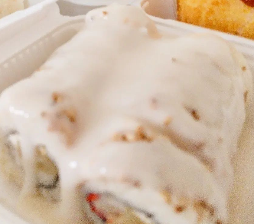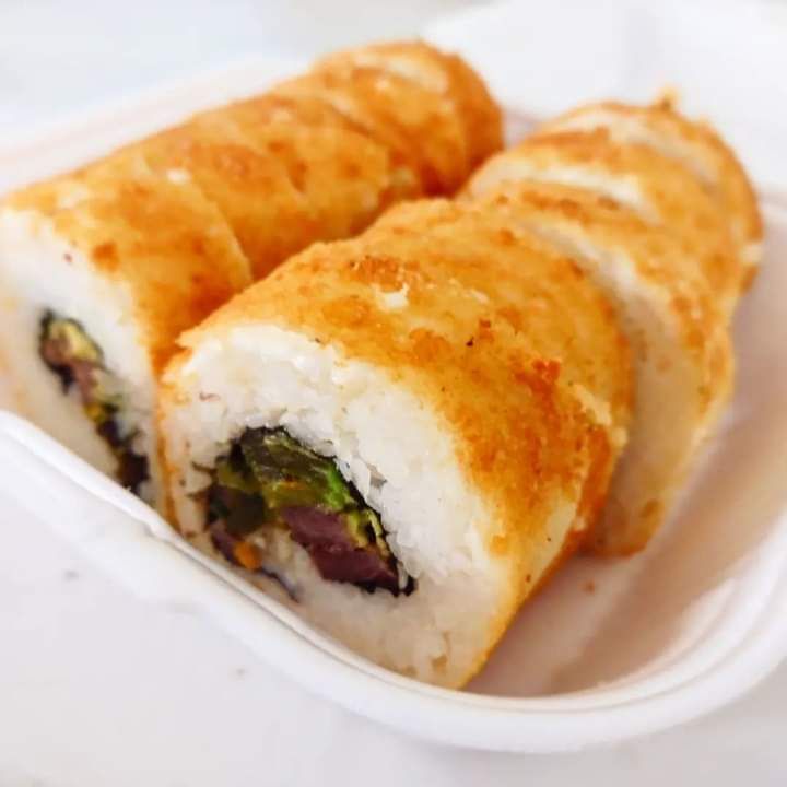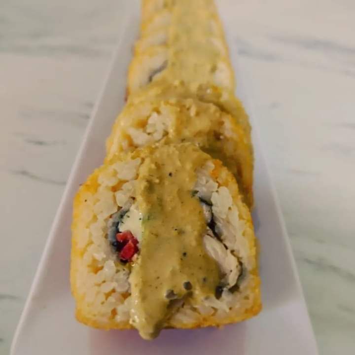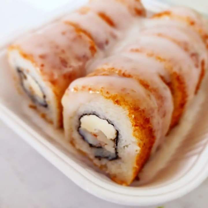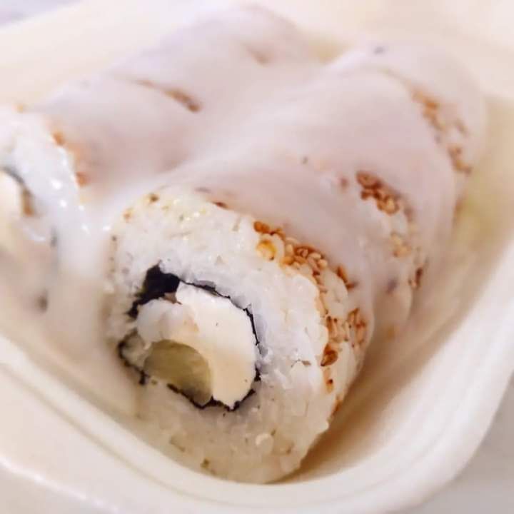 Camarón capeado, aguacate y philadelphia, cubierto de crema de coco.