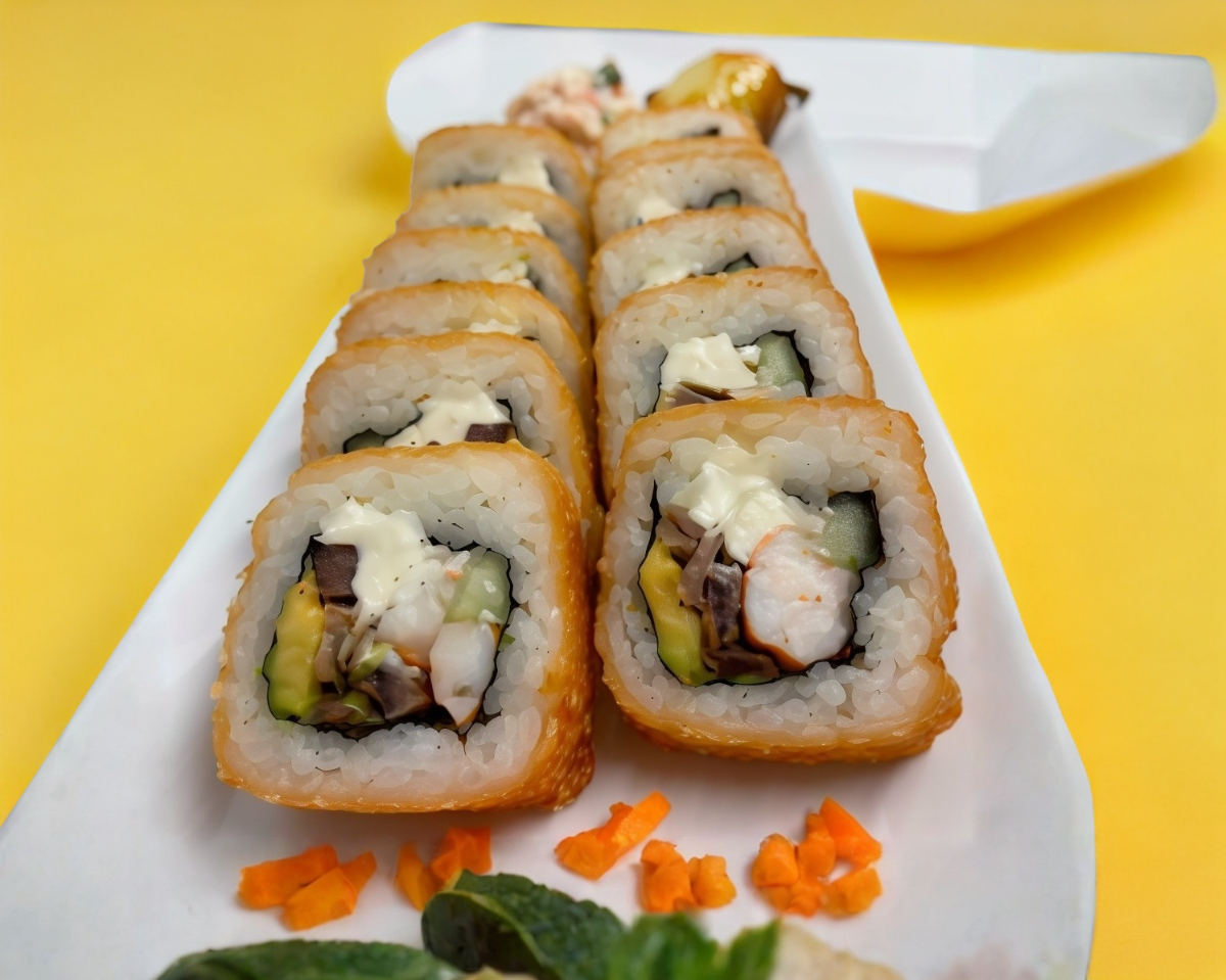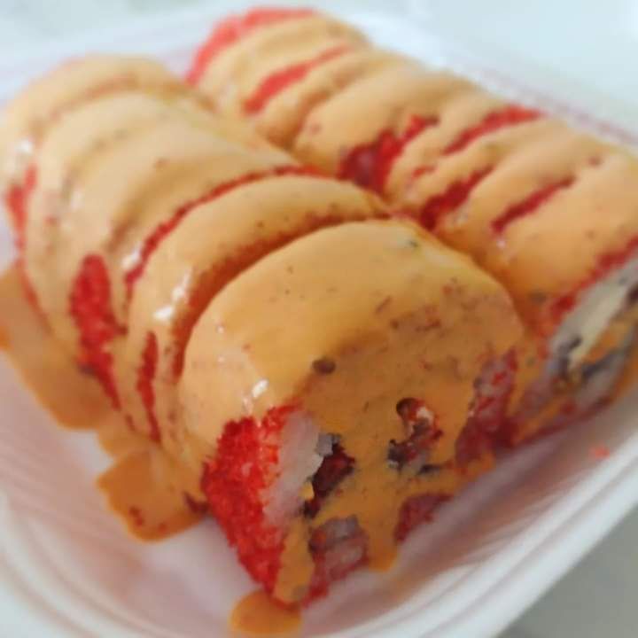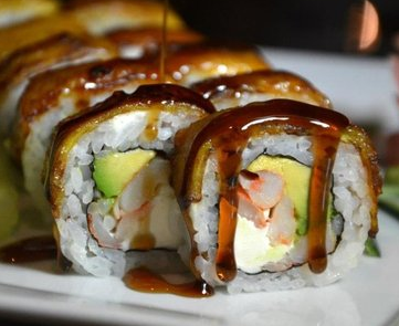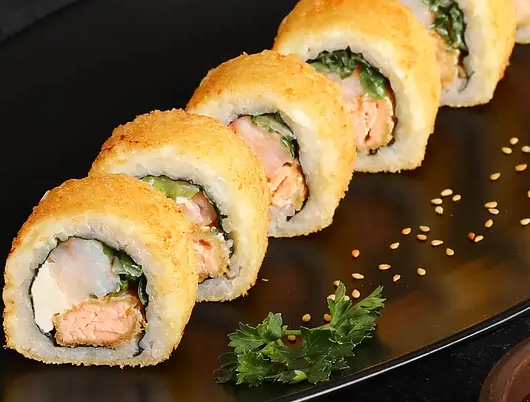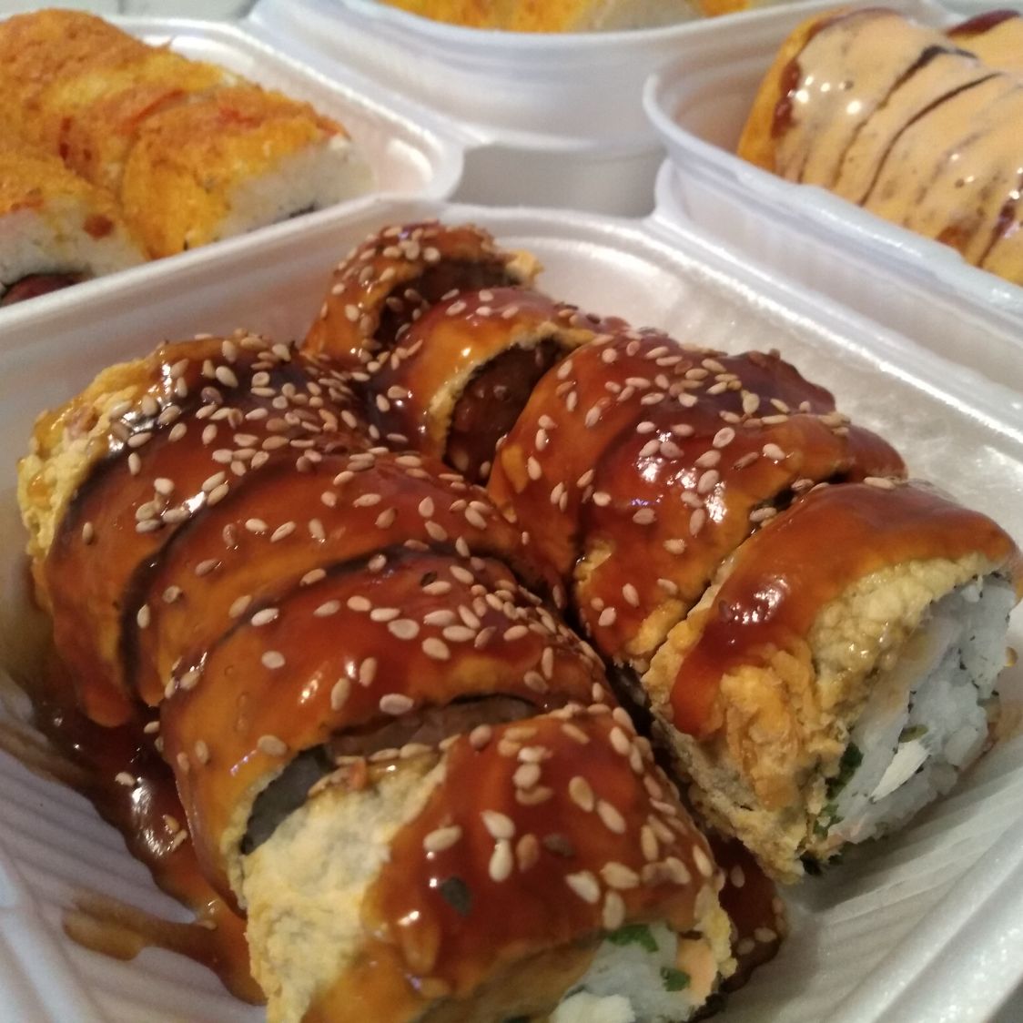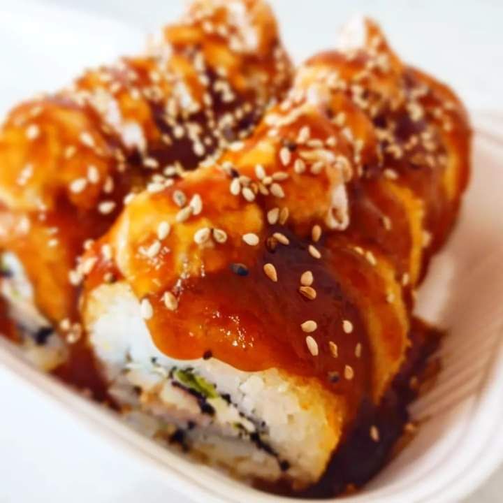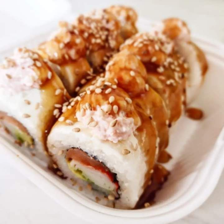 Salmón, camarón, surimi, philadelphia y aguacate, bañado en salsa de anguila, chipotle y ajonjolí