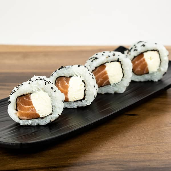 Salmón, philadelphia y cebollin, bañado en salsa de anguila y ajonjolí