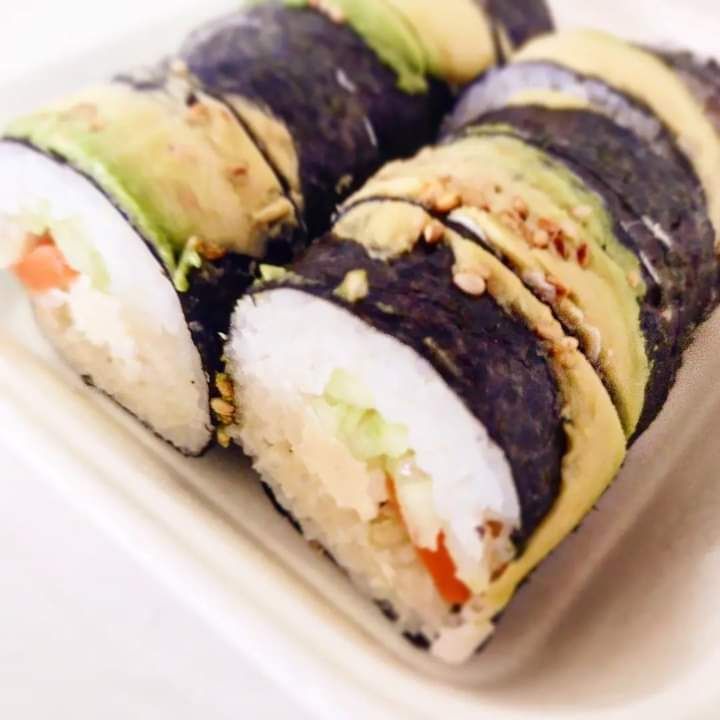 Salmón, camarón, surimi, pepino y philadelphia, cubierto de alga, aguacate y ajonjolí