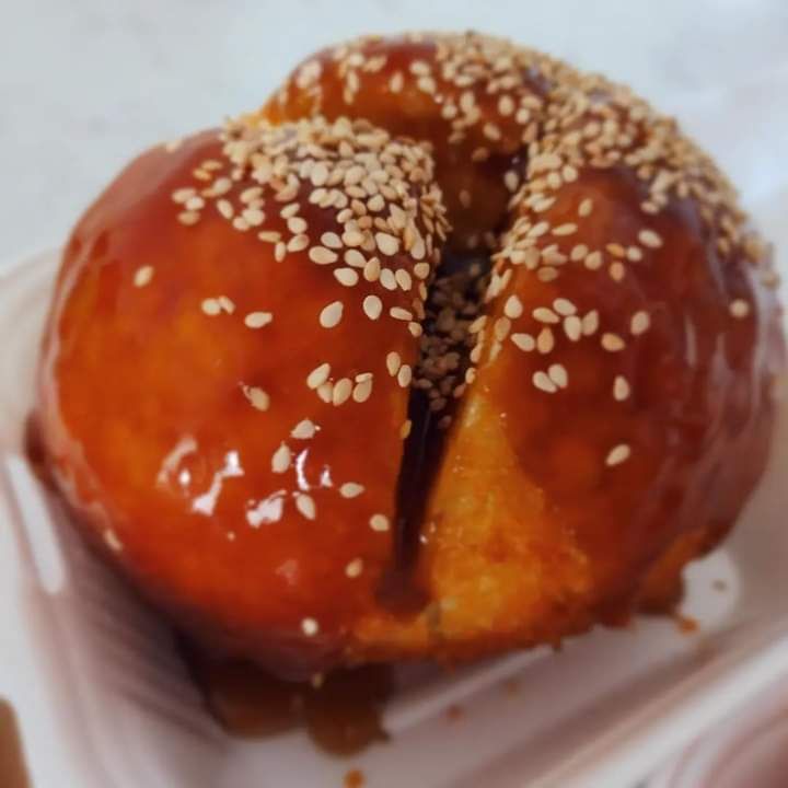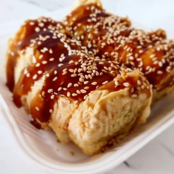 Camarón, surimi, piña en almíbar y tocino, bañado en salsa de anguila y ajonjolí
