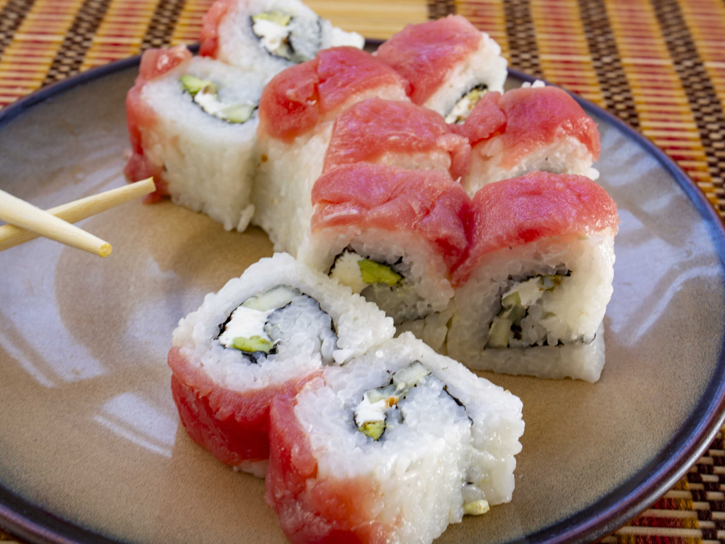 Pepino, aguacate, camarón tempura, Philadelphia, tártara, cebollín, cubierto de atún.