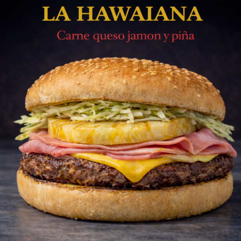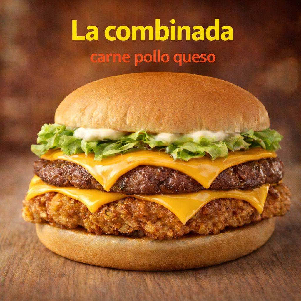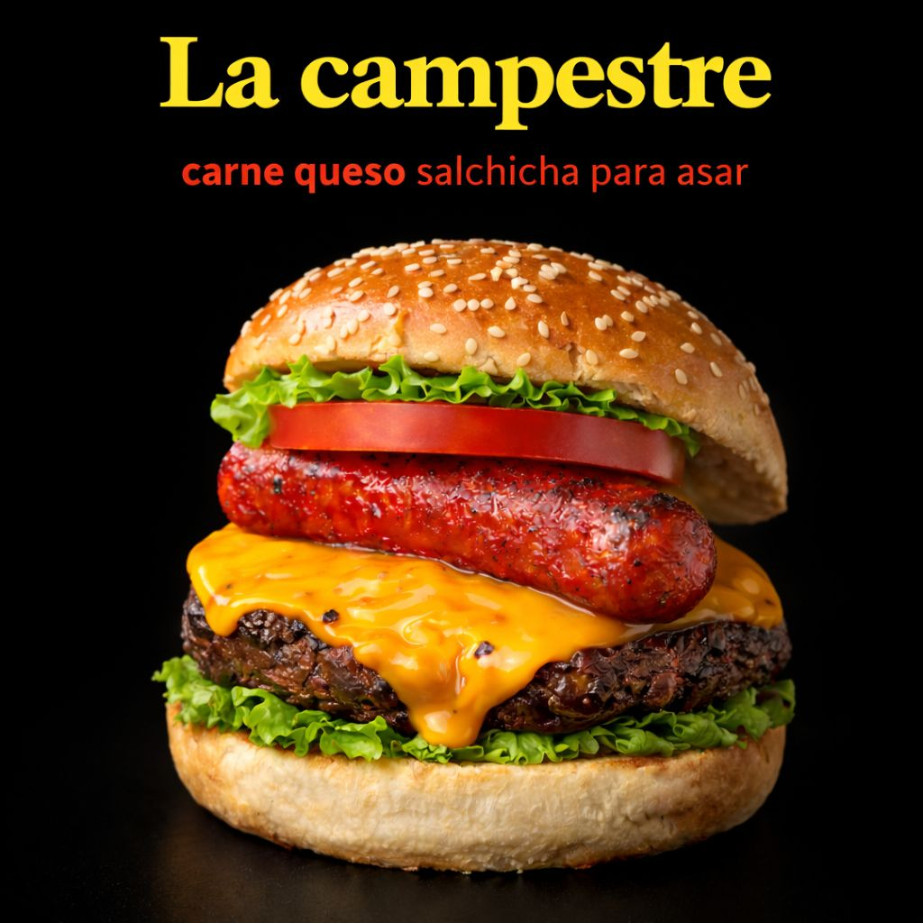 Hamburguesa doble con 2 carnes, 2 quesos y salchicha para asar.