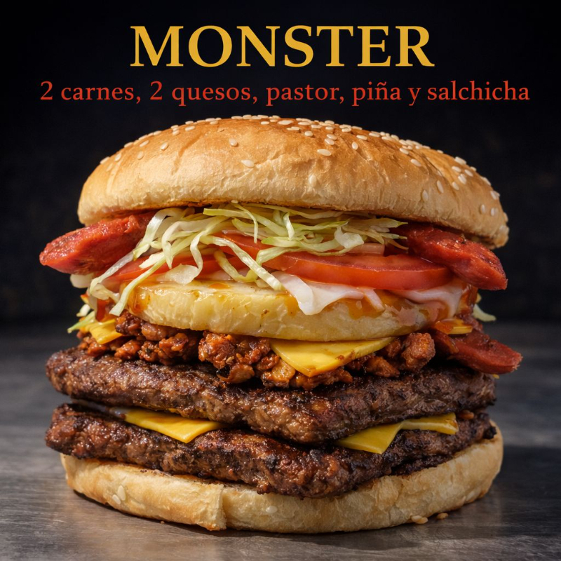 2 carnes, 2 quesos, pastor, piña y salchicha.