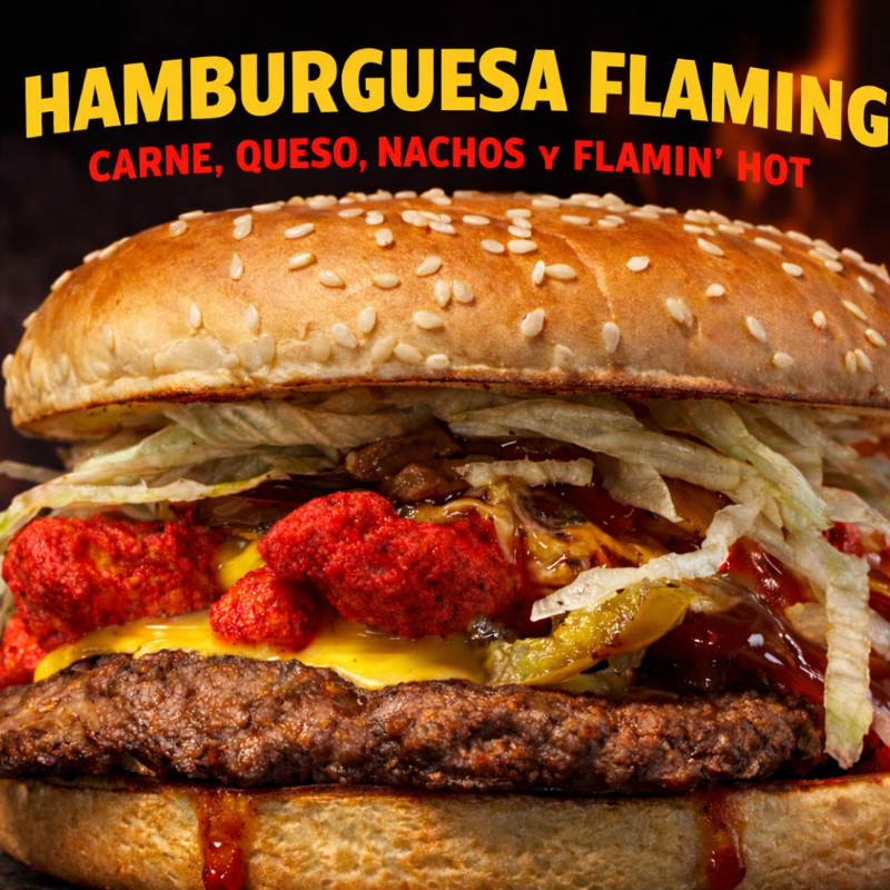 Carne, queso, Cheetos Flamin Hot y queso nacho.