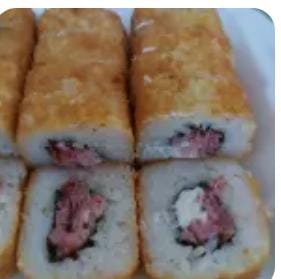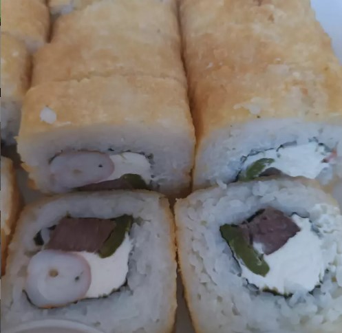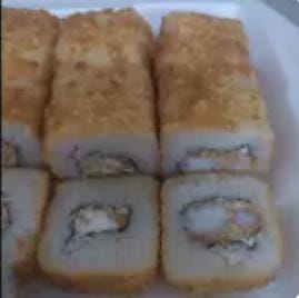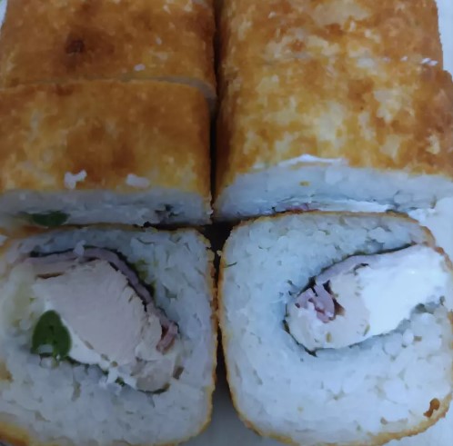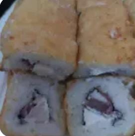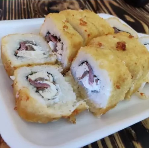 Delicioso rollo de sushi empanizado , carne ,pollo ,tocino ,queso crema , y queso mozzarella por fuera