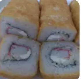 delicioso rollo empanizado , cangrejo , mozarella y piladelfia
