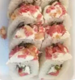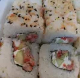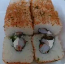 Delicioso rollo de sushi previamente freido preparado con camaron, carne ,chile california y queso crema