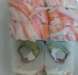 camaron, cangrejo, surimi, marlin ahumado y queso crema por dentro y algo por fuera