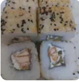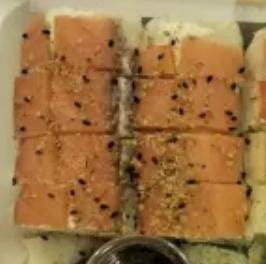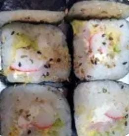 cangrejo, surimi y queso crema philadelphia por dentro y ajonjoli negro por fuera