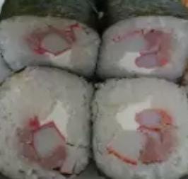cangrejo, surimi, aguacate, queso crema philadelphia y cebollin por dentro y alga por fuera