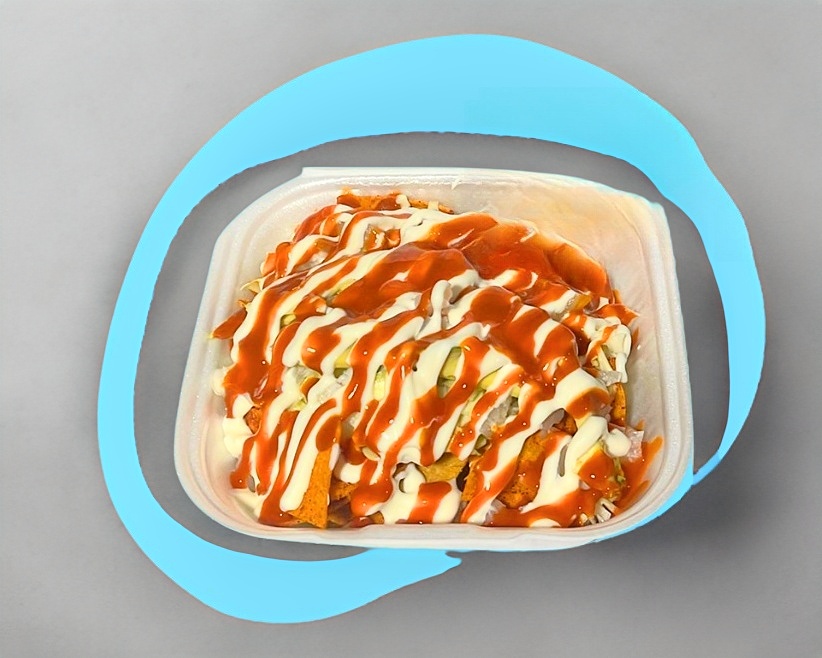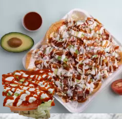 Chicharron con repollo,cueritos, aguacate, tomate, crema, limon y salsa valentina