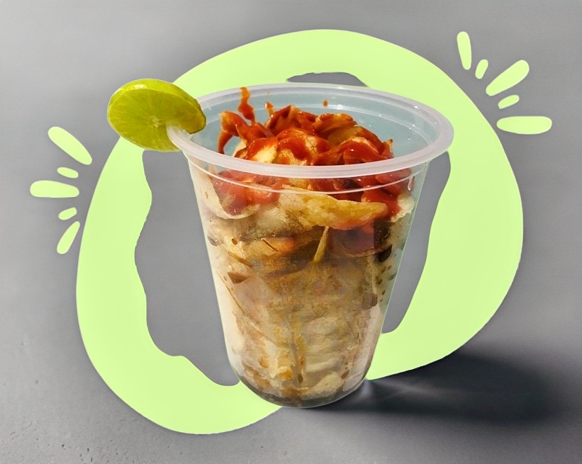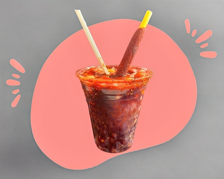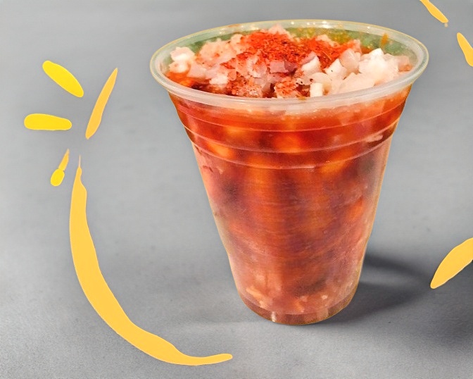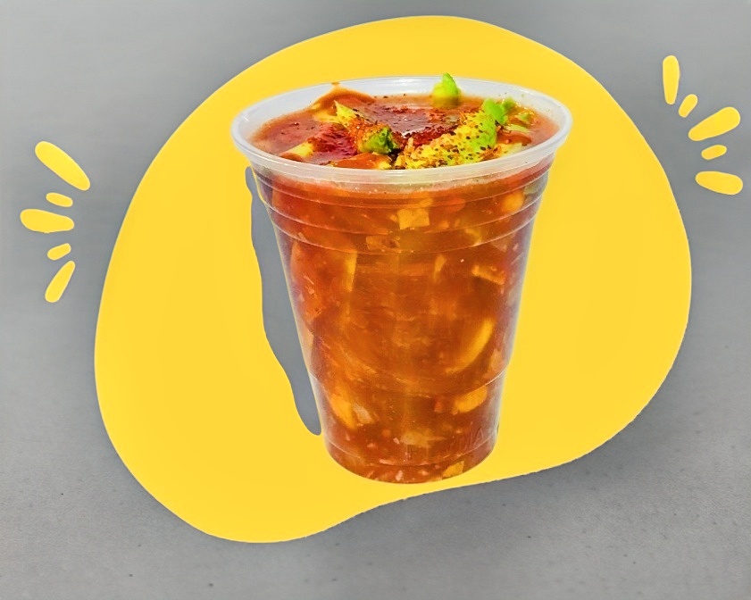 Vaso de cueritos preparado al gusto, con clamato, salsa negra, valentina, chamoy, limon, tico y tajin