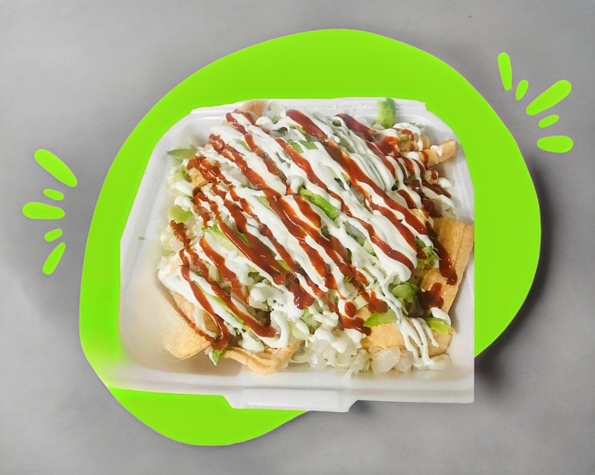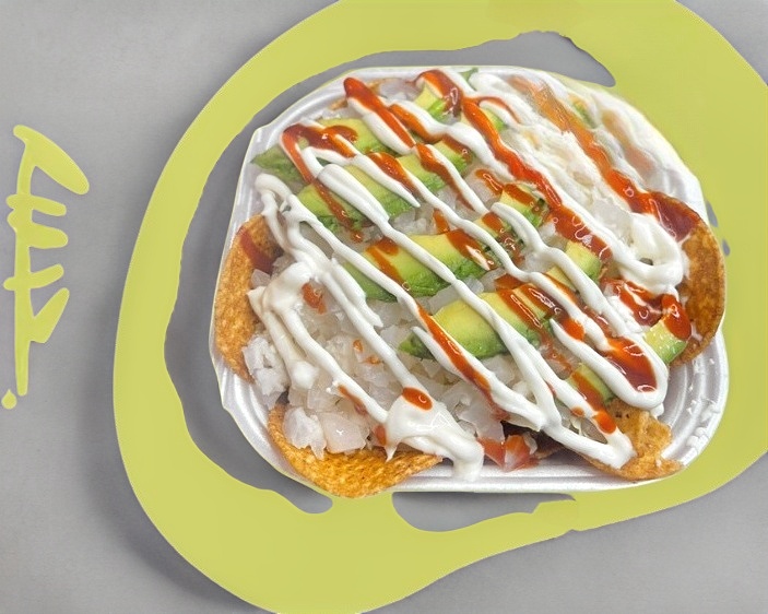 Ricas Tostaditas Preparadas con repollo, cueritos, aguacate, limon, crema y salsa valentina