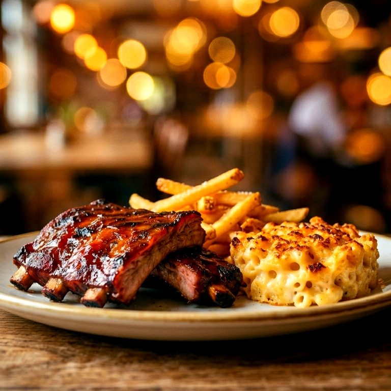 2 personas. Costillas, papas gajo, mc and cheese y salsa aparte