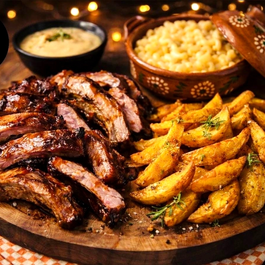 4 personas. Costillas, papas gajo, mc and cheese y salsa aparte
