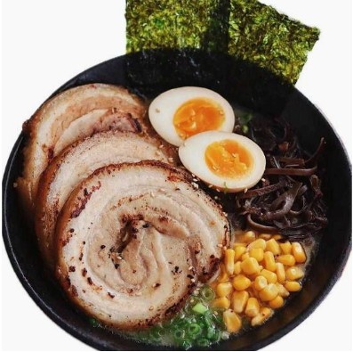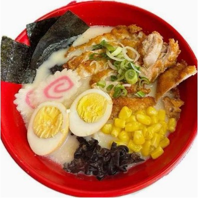 Puerco, huevo cocido, germinados, black fungus, alga, elote, narutomaki.