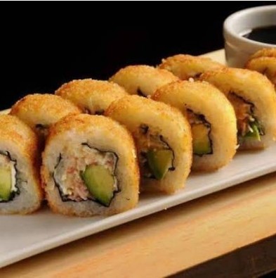 Pollo frito, aguacate, pepino, salsa anguila, furikake, cubierto de philadelphia y ajonjolí.