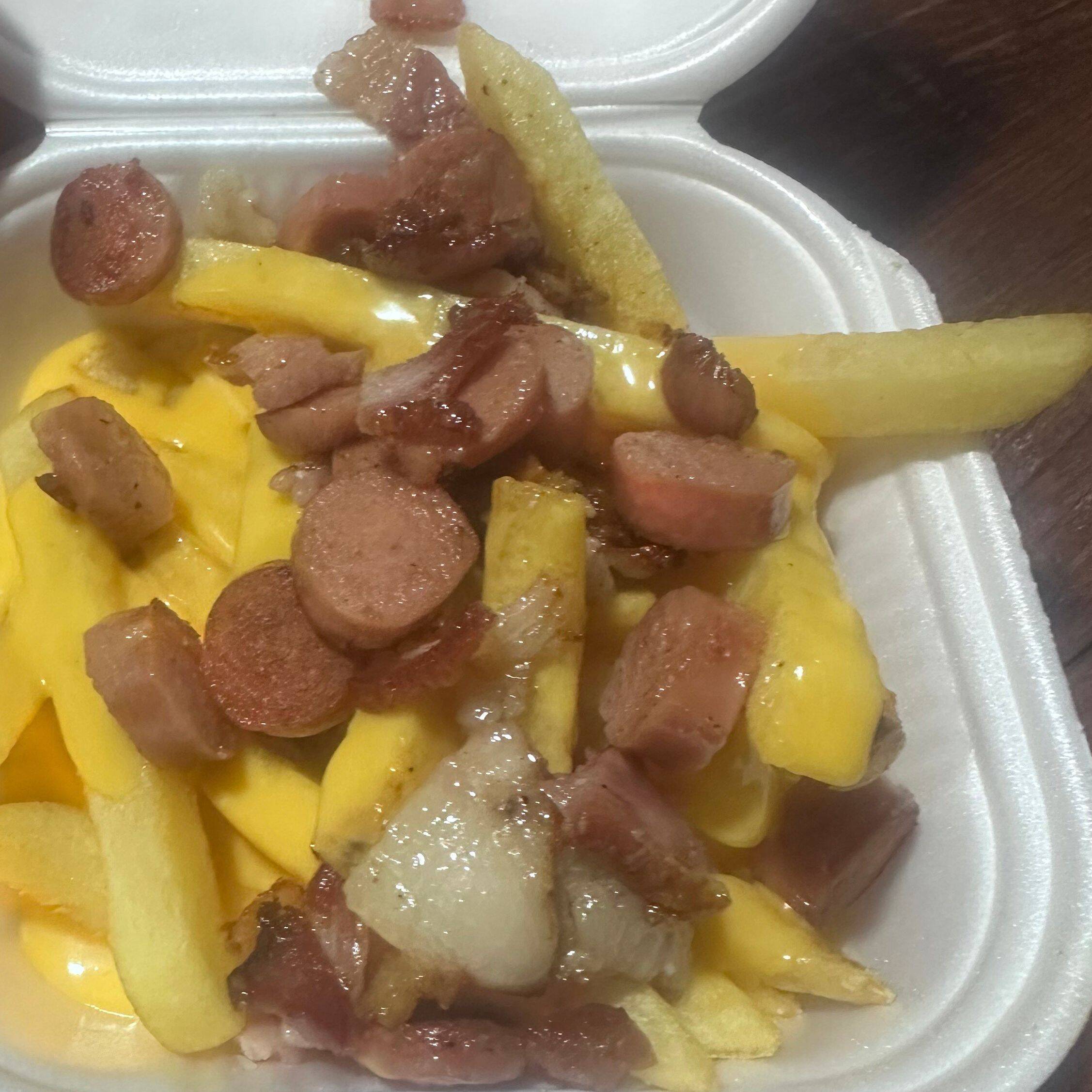 200 gramos de papas fritas con tocino y queso cheddar.