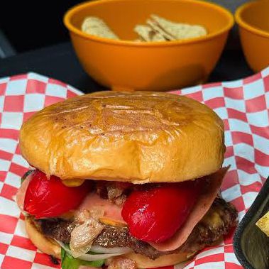 Carne 100% sirlon, queso, lechuga, tomate, cebolla, pepinillos, jamón, aguacate y líquidos.