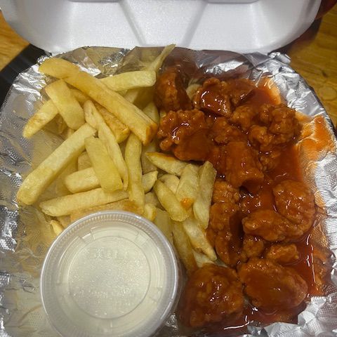 Boneless 300 gramos bañados con nuestras salsas, 200 gramos papas y aderezo.