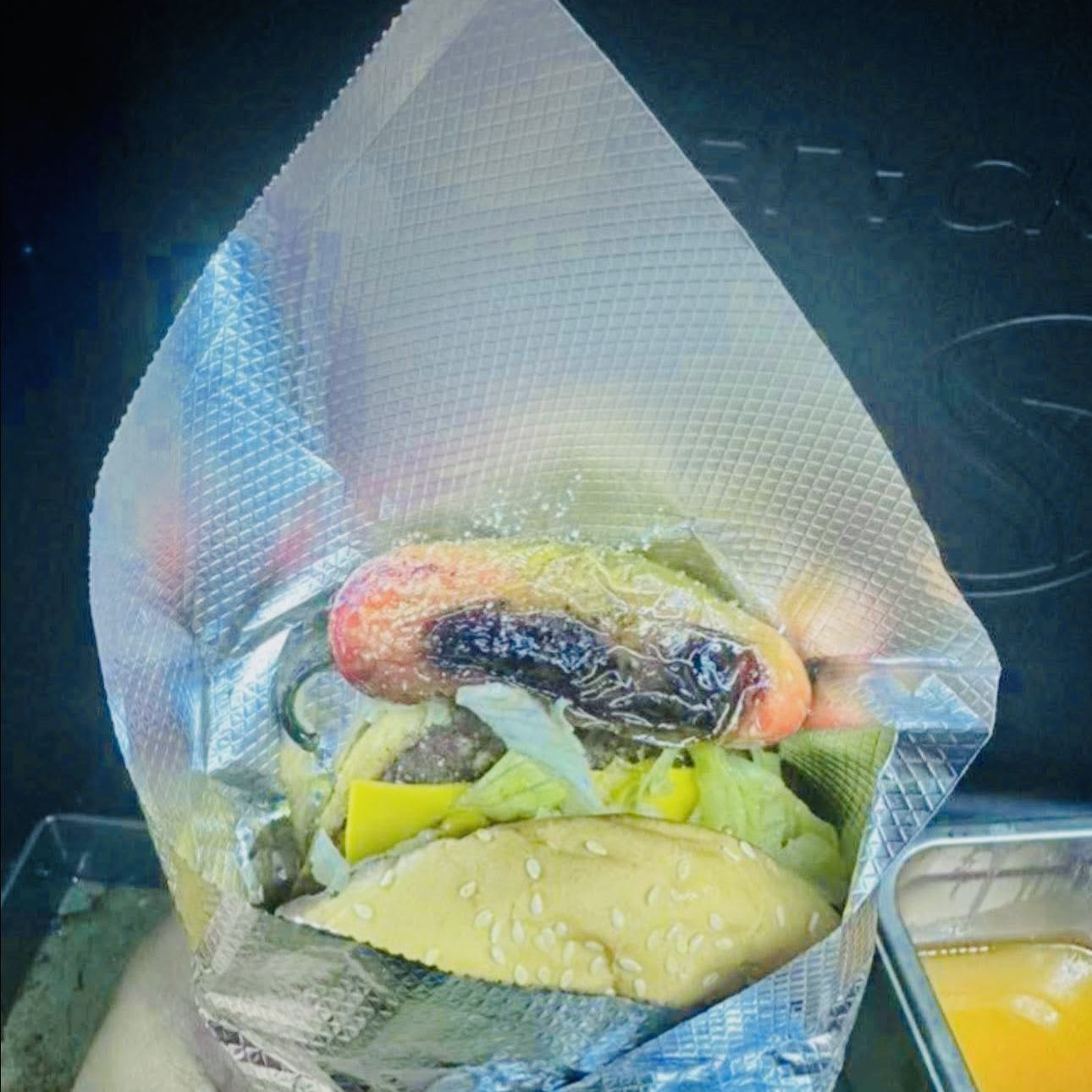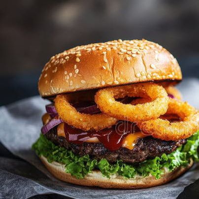 Carne, queso, lechuga, tomate, aguacate, jamón, aros de cebolla y líquidos.