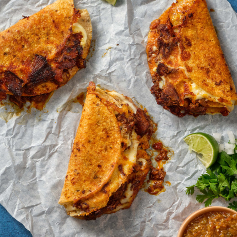 orden con 5 tacos dorados de birria con nuestro rico queso que se derrite en tu paladar