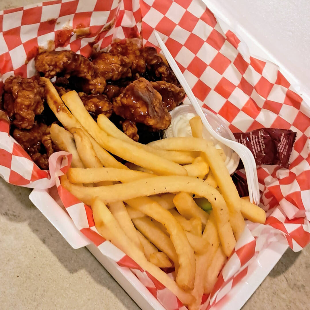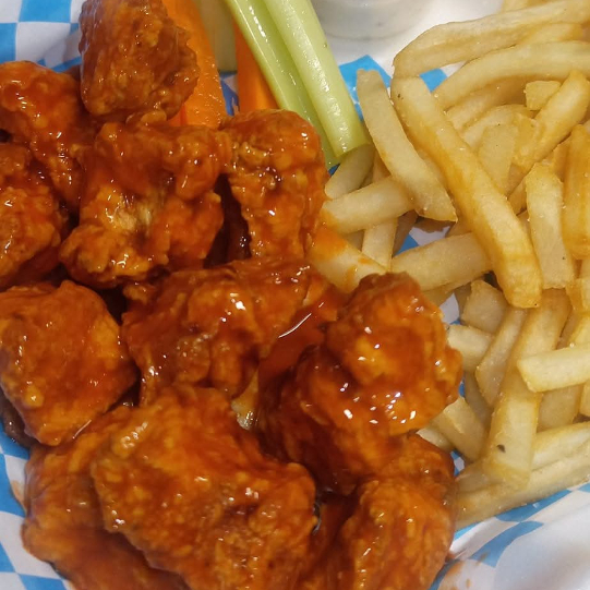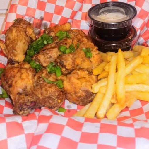 2kg pechuga de pollo, 1kg de papas fritas , 6 salsas diferentes