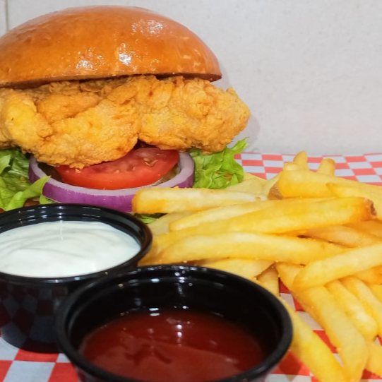 Pechuga de pollo empanizada, lechuga tomate cebolla y liquidos.