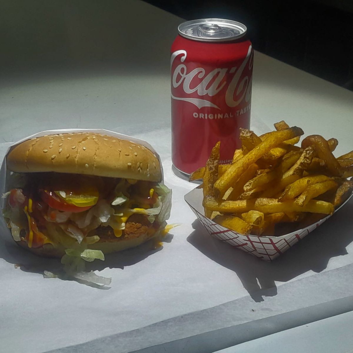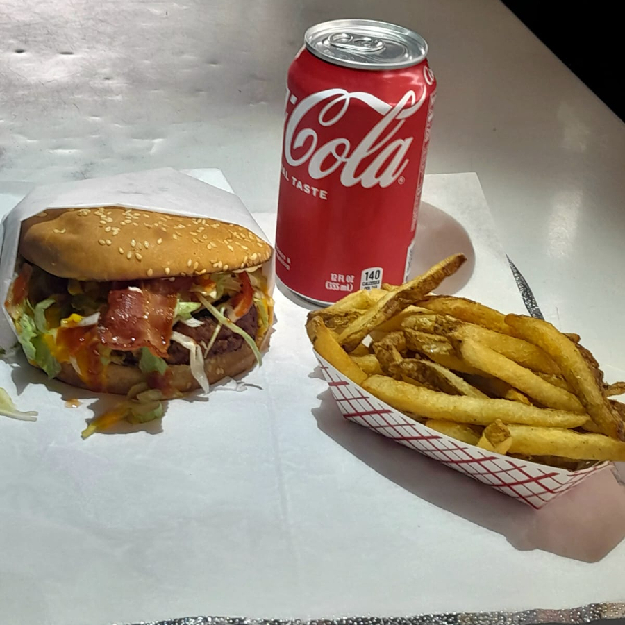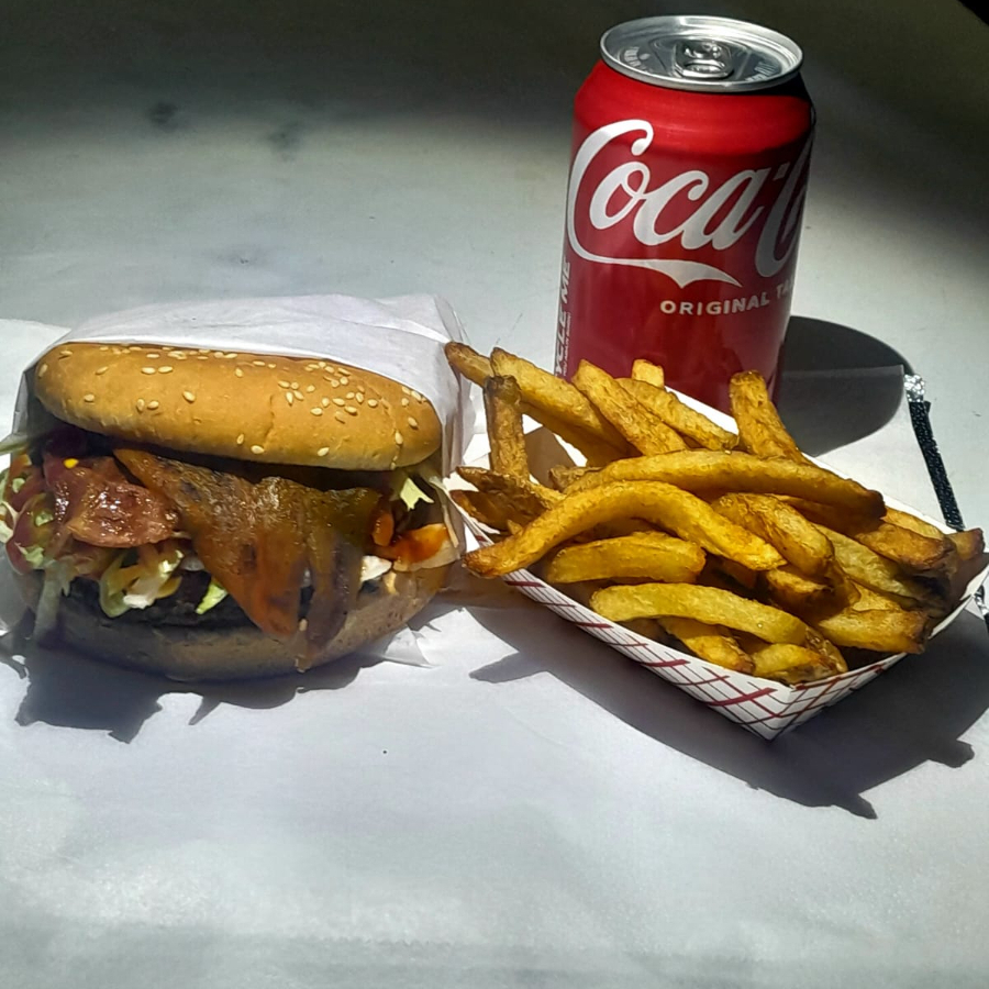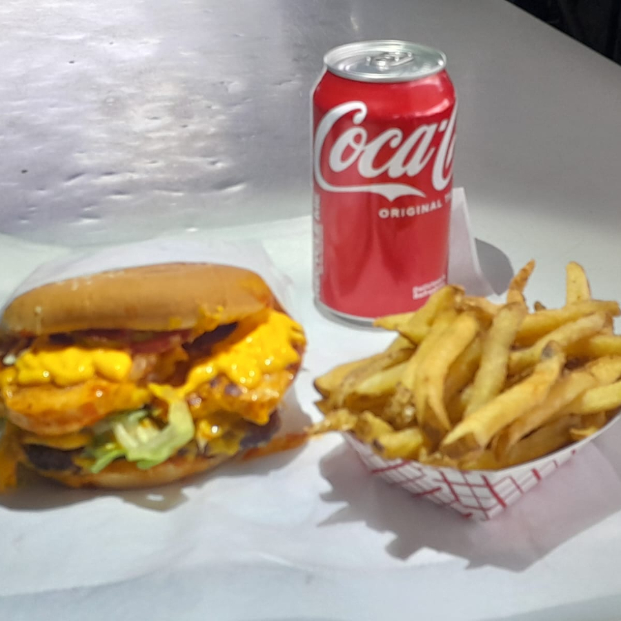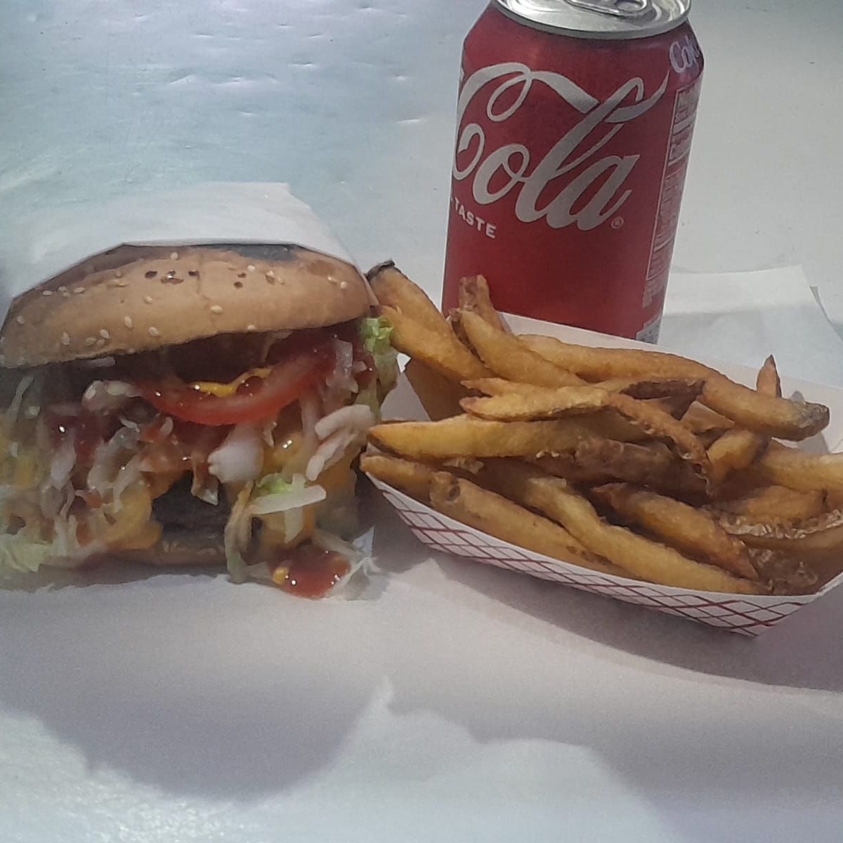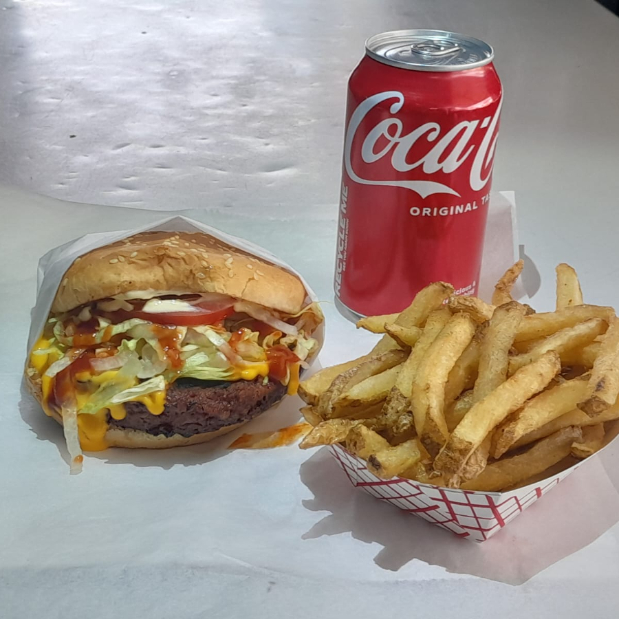 Combo sencilla 1/4lb van acompañadas con queso de nachos ,mayonesa,mostaza ketchup, lechuga,cebolla,picada rebanadas, de tomate, pepinillos y papas naturales, carne al mesquite y carbon