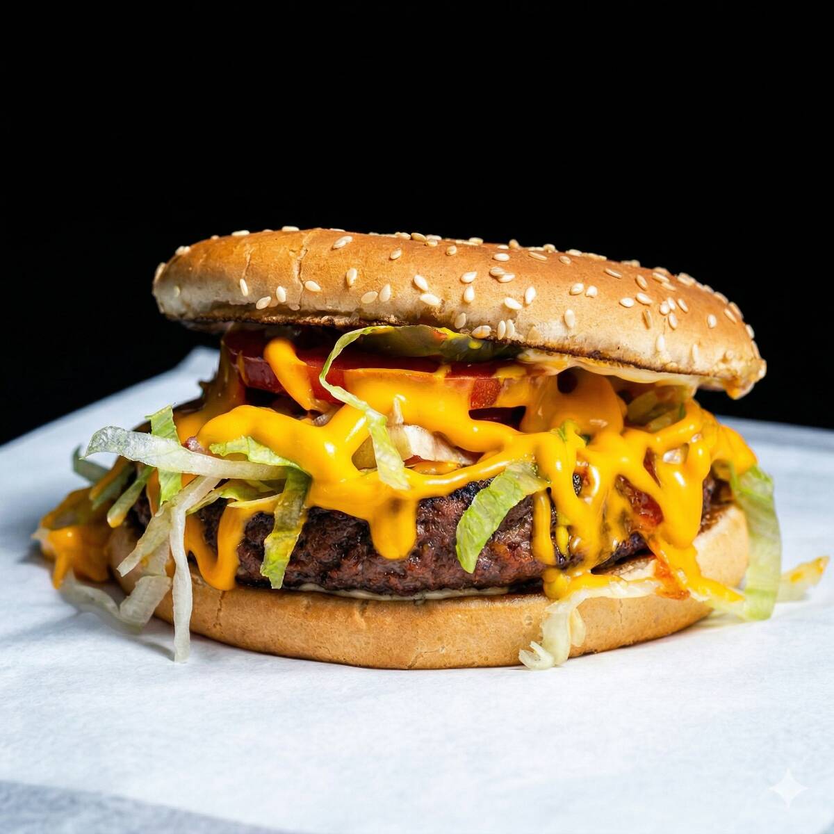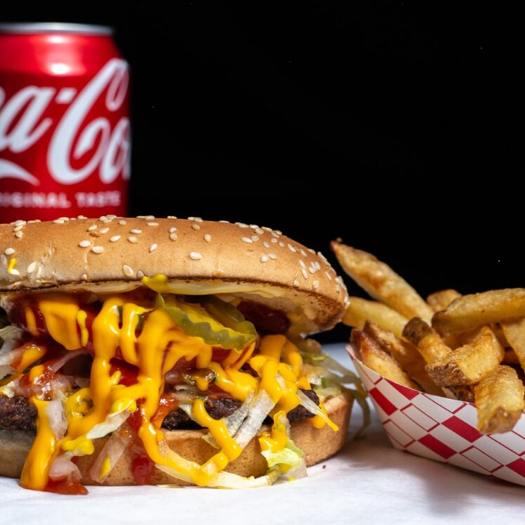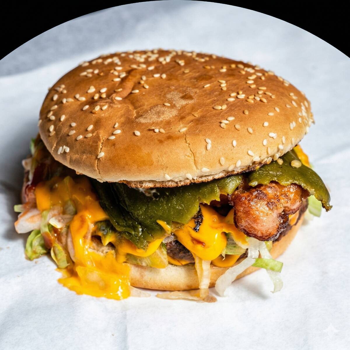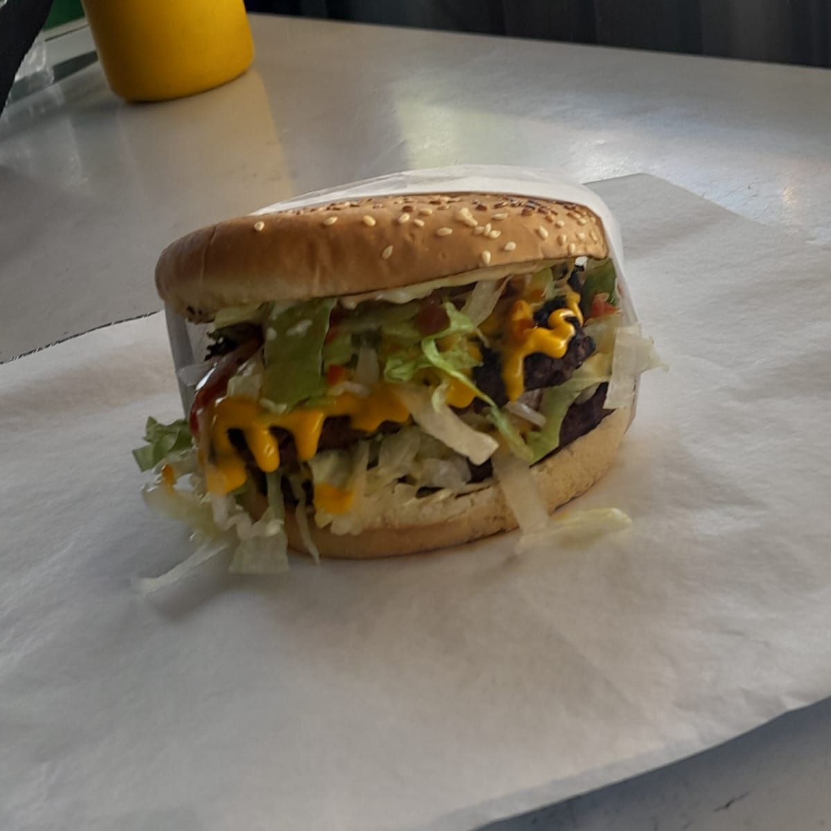 2 pzs. de carne de res de 1/4 libra, acompañada de queso para nachos, lechuga y cebolla picada, rebanadas de jitomate y pepinillos y chiles jalapeños estilo LA Burguer.