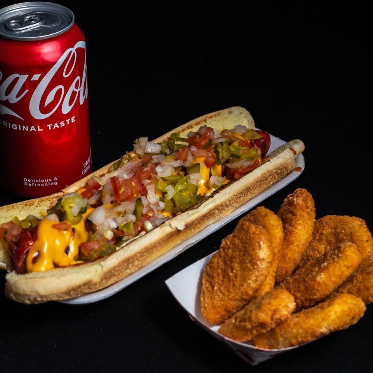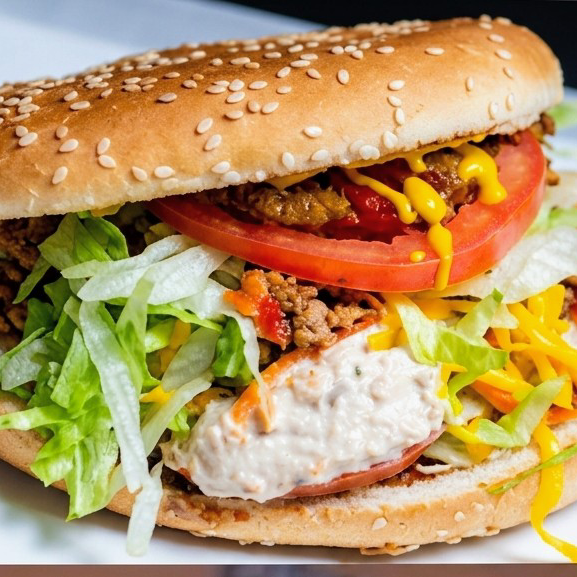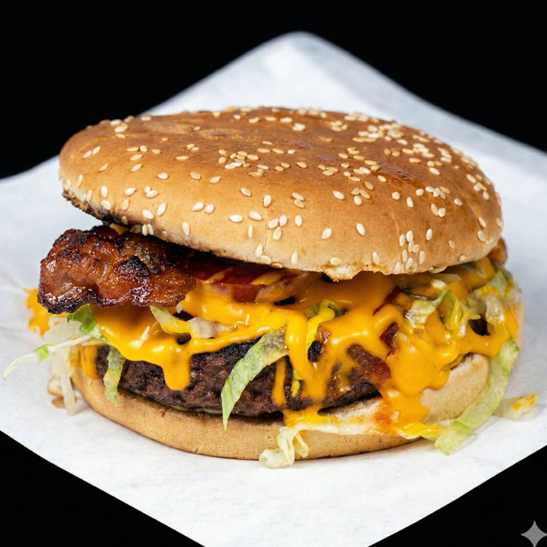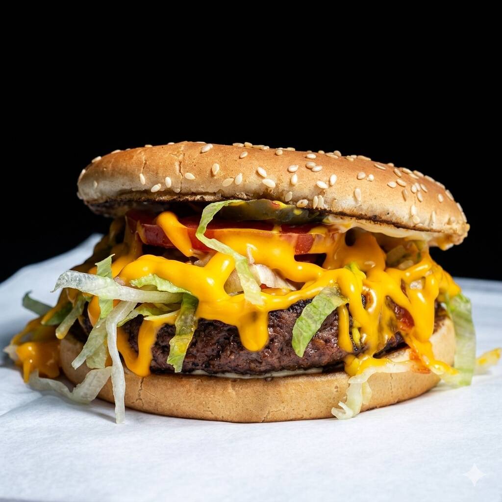 2 pzs. de carne de res de 1/4 libra, acompañada de queso para nachos, lechuga y cebolla picada, rebanadas de jitomate y pepinillos y chiles jalapeños estilo LA Burguer.