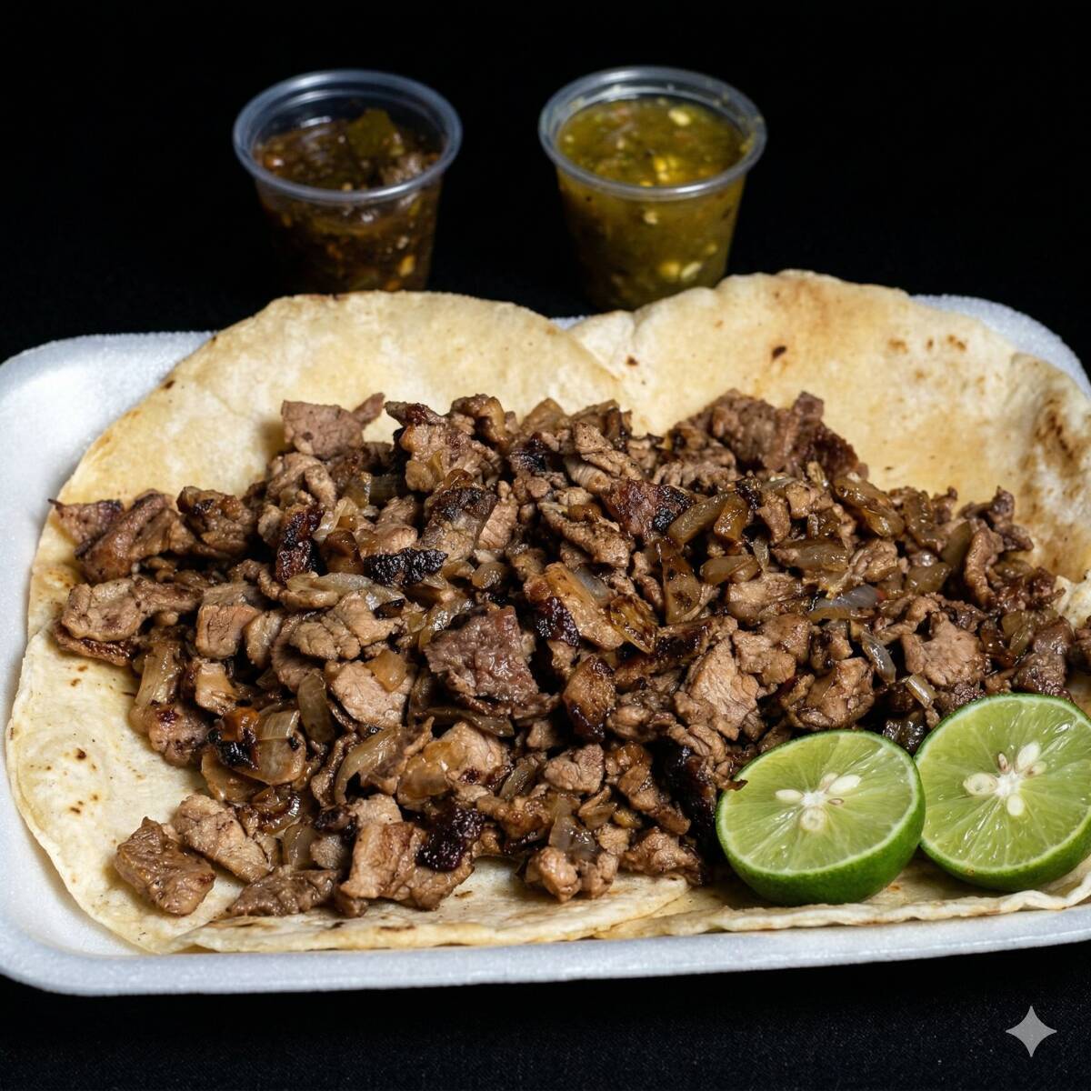 Tacos de bisteck de res, con cebolla y 4 tortillas caseras