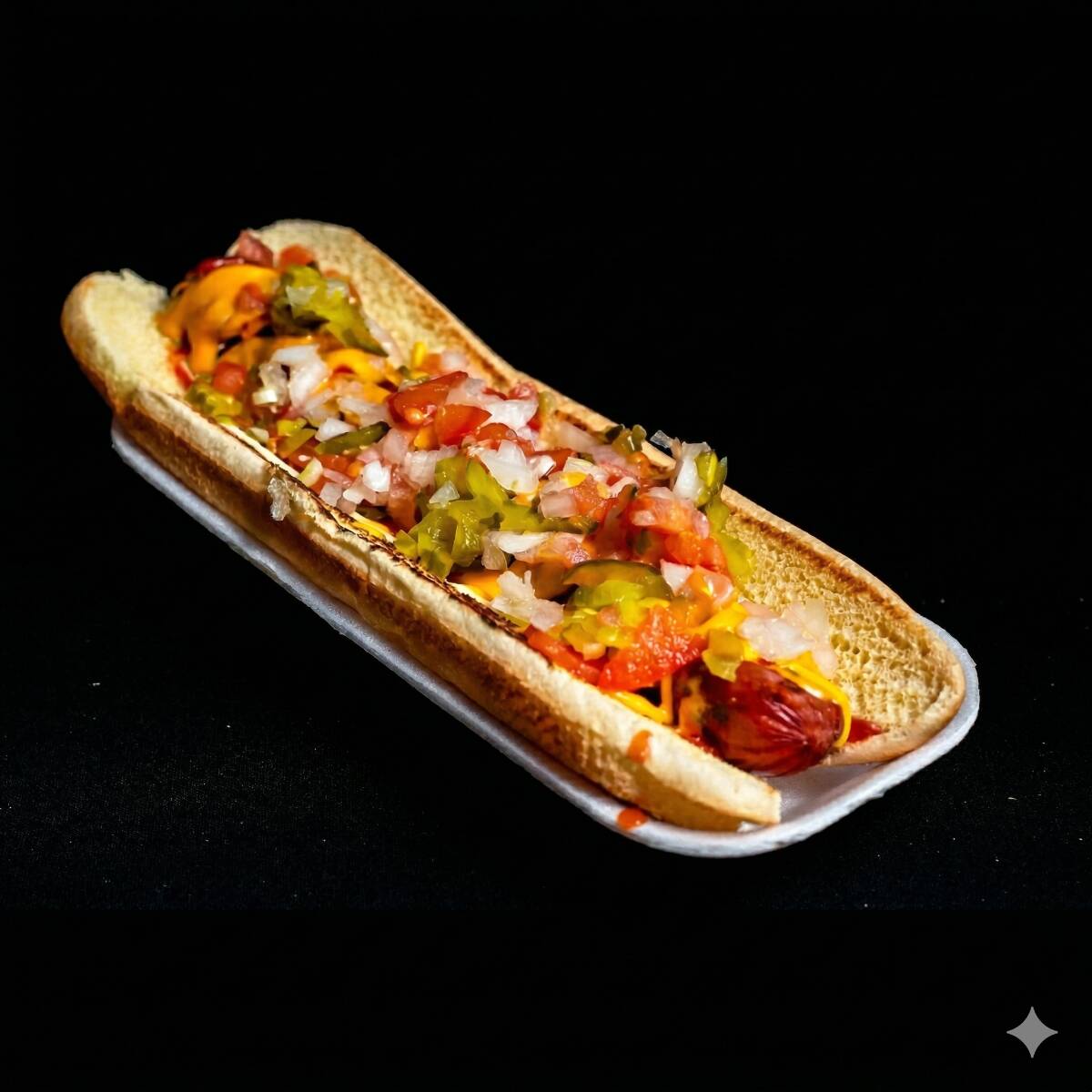 Sasonada con habanero 1/2lb van acompañadas con queso de nachos ,mayonesa,mostaza ketchup, lechuga,cebolla,picada rebanadas, de tomate, pepinillos y papas naturales ,carne al mesquite y carbon