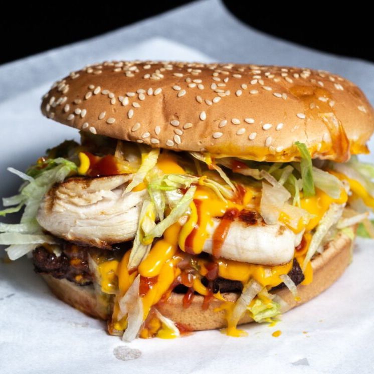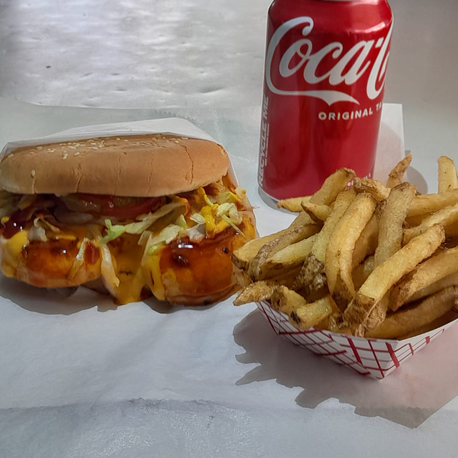 Pechuga dé pollo, sencilla 1/4 de libra sirloin,van acompanadas con queso de nachos ,mayonesa,mostaza ketchup, lechuga,cebolla,picada rebanadas, de tomate, pepinillos y papas naturales,carne al mesquite y carbon