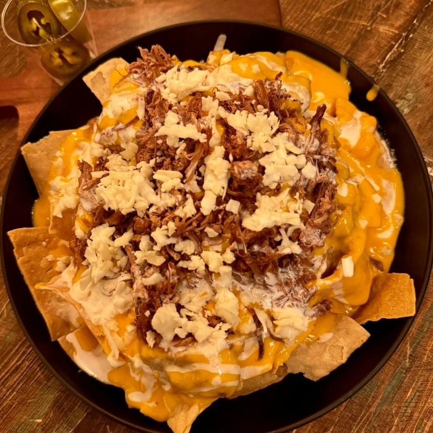 Nachos acompañados de frijoles puercos, queso amarillo y carne de res y un toque de crema acida. Salsa piña habanero y jalapeños.