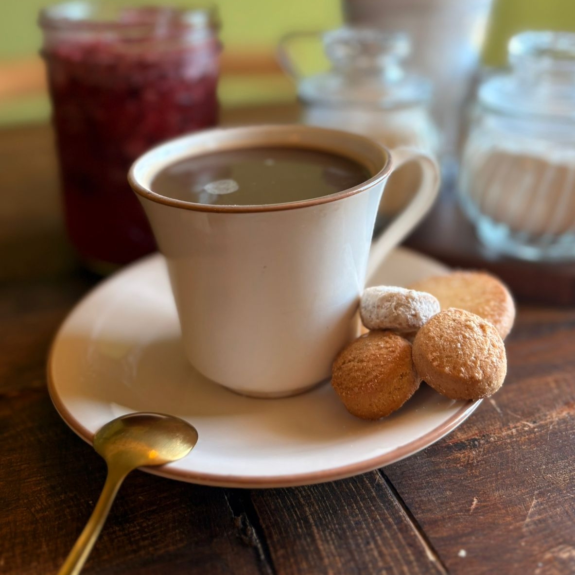 Café hervido con piloncillo, canela, y endulzantes de la casa