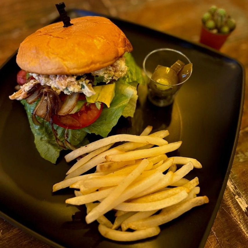 Hamburguesa, carne de res a la plancha, ingredientes tradicionales, aderezos mixtos con relleno de salsa en queso philadelphia con tocino y jalapeños, acompañado de papas fritas. Salsa de Piña Habanero-BBQ-Bufalo-Jalapeño.