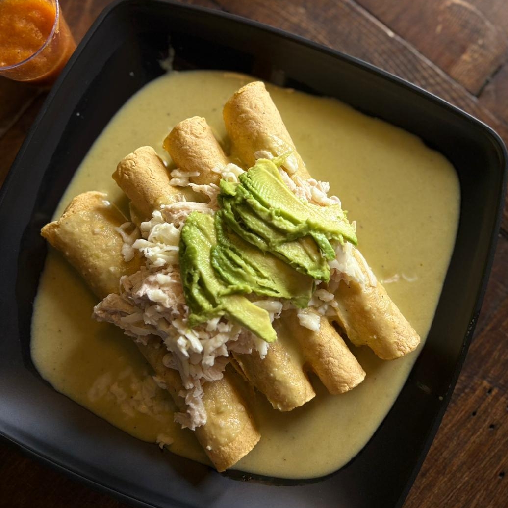 Acompañado de Arroz blanco y ensalada fresca, tortilla envuelta en pechuga de pollo, bañadas en salsa de crema verde, gratinadas en queso blanco.