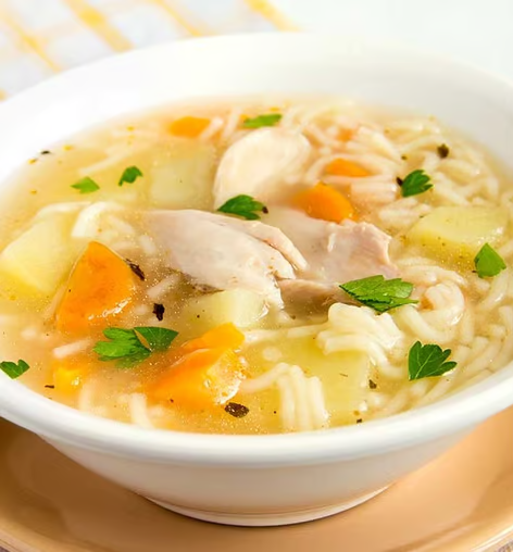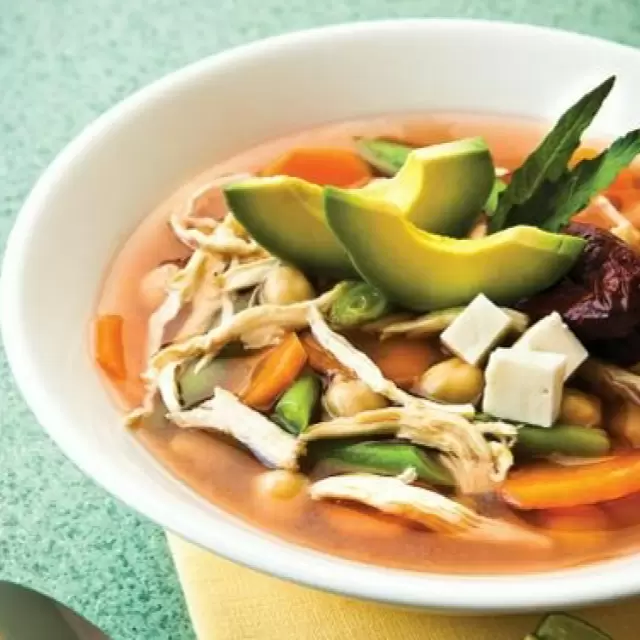 Consomé con pechuga de pollo 160 gr servido con arroz blanco, acompañado de aguacaate, chile, cebolla y tomate picados.